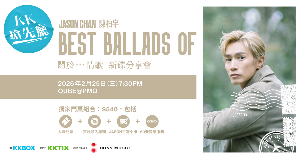 門票價格 HK$540(組合包括:入場門票 + Jason親筆簽名《BEST BALLADS OF 關於...情歌》專輯 + Jason手寫小卡一張 + 60日KKBOX音樂服務序號)